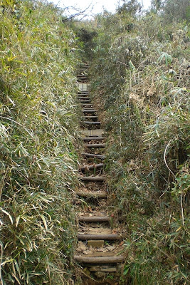 花見川サイクリング道路を歩いていると横戸台下で2箇所の手製連絡通路があり、横戸緑地に登れるようになっています。横戸緑地と花見川サイクリング道路を連絡して散歩を愉しみたいという人がつくった通路のようです。横戸緑地の上流端付近の通路は急勾配の階段で男坂、下流端付近の通路は斜面をだらだら登る坂で女坂になっています。上流側の階段は登りきると緑地の柵が邪魔しているので、身をかがめて柵の下をくぐり抜けなければ通行できません。下流側は緑地の柵が丁度途切れるところなのですり抜けられます。二つの通路とも、誰かが時々補修してくれているようです。ありがたいことです。