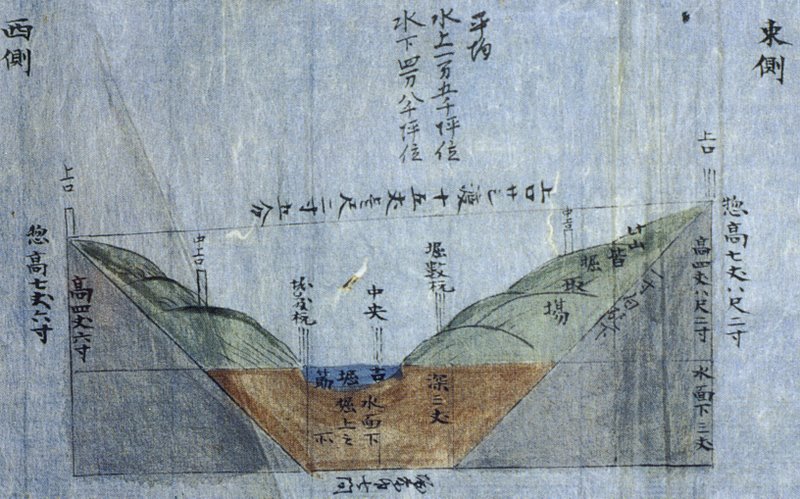 上の図は天保の「堀割普請断面図」(鶴岡市郷土資料館寄託 清川齋藤家文書)〔「天保期の印旛沼堀割普請」(千葉市発行)掲載〕であり、古堀筋(天明期堀割普請の跡)の周囲の斜面を掘削して堀割を作る計画断面を示しています。