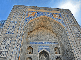 WEB等からは、サマルカンドやブハラを支配していた当時の支配者が、偶像崇拝を否定するイスラム教義に反して、自分の顔をイスラム神学校のイーワーンに描かせ、自分の権力を誇示したのではないかという解説情報を得ることができます。
