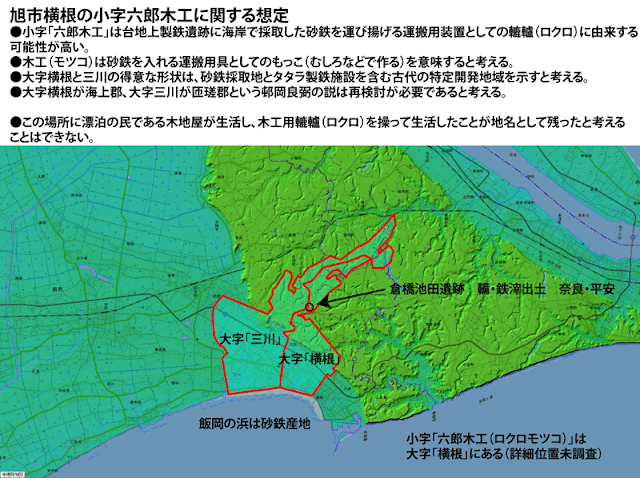 ●小字「六郎木工」は台地上製鉄遺跡に海岸で採取した砂鉄を運び揚げる運搬用装置としての轆轤(ロクロ)に由来する可能性が高いと考えます。