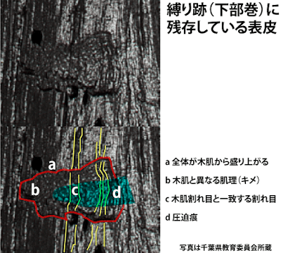 表皮をまるでえぐったように凹ませた強い締め力の様子とA面に見られる木肌の縛り跡様子との間に整合があるのかどうか疑問が生れます。