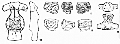 「国立歴史民俗博物館研究報告第37集」(1992年)の「東京都の土偶」における中期前半土偶について、8を祖形とし、17~19が河童形土偶であり、棚畑遺跡例に共通する形態であると説明しています。ハート形の顔にフードを被ったような頭を特徴としてます。