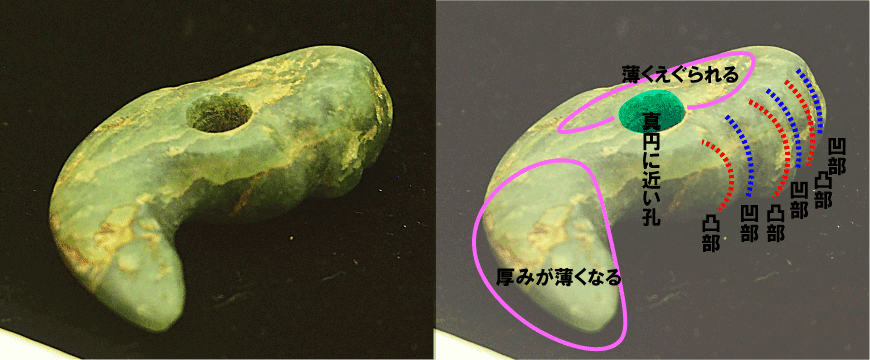 ・全体の形状が勾玉になっています。勾玉という玉の在り方は縄文時代から古代へと引き継がれていきます。縄文時代に作られた勾玉の意味、効果、使い方の基本が古代へと引き継がれたと考えます。このことは、縄文祭祀が弥生時代にほとんど廃絶した中で、特筆すべき事柄です。